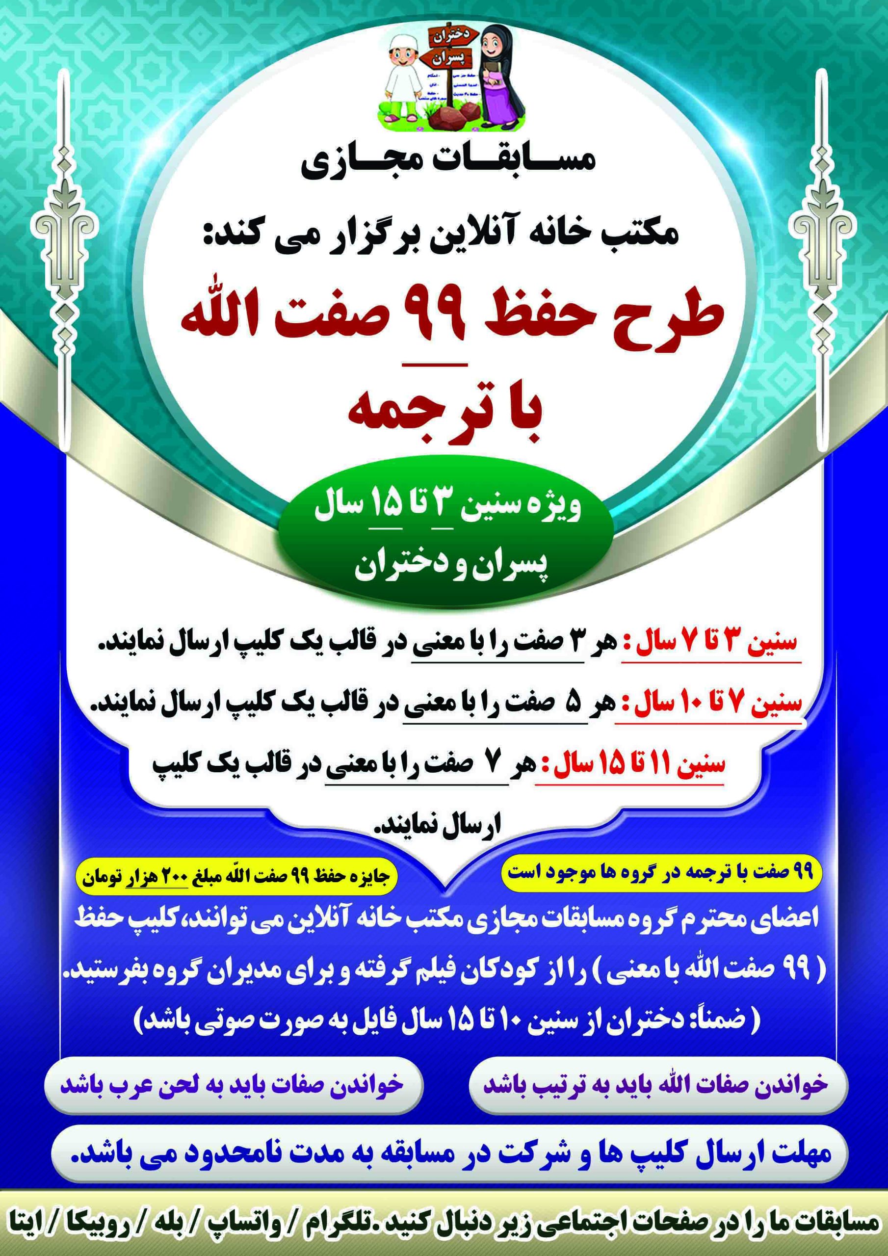 این مسابقه از سلسله مسابقات مجازی مکتبخانه آنلاین و ویژه کودکان و نوجوانان ۳ تا ۱۵ سال است و به حفظ ۹۹ صفت الله همراه با ترجمه اختصاص دارد؛ مهلت شرکت نامحدود بوده و شرکتکنندگان باید بر اساس سن، در هر کلیپ تعداد مشخصی از صفات را با معنی ارائه دهند: گروه ۳ تا ۷ سال هر ۳ صفت، گروه ۸ تا ۱۰ سال هر ۵ صفت و گروه ۱۱ تا ۱۵ سال هر ۱۰ صفت را در قالب یک کلیپ باید ارسال کنند. متن رسمی صفات الله با ترجمه نیز بهصورت فایل PDF در گروه مسابقات در دسترس است و حفظ باید مطابق همان متن باشد.